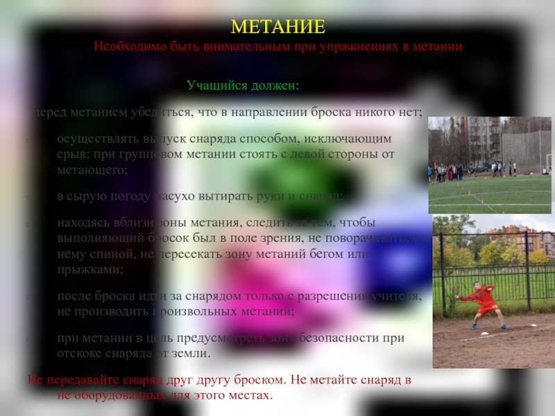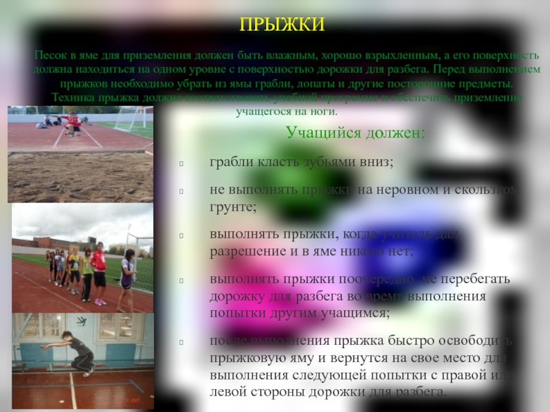 Песок в яме для приземления должен быть влажным, хорошо взрыхленным, а его поверхность должна находиться на одном уровне с поверхностью дорожки для разбега. Перед выполнением прыжков необходимо убрать из ямы грабли, лопаты и другие посторонние предметы.
