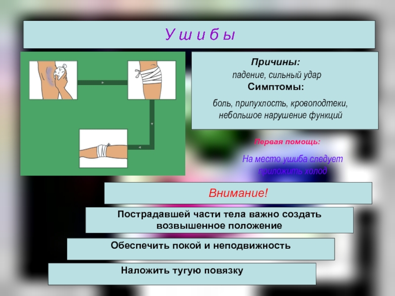 поврежденную конечность приподнять, наложить тугую повязку или жгут (при сильном кровотечении)