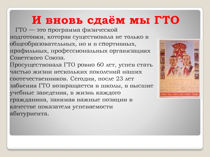 Просуществовала ГТО ровно 60 лет, успев стать частью жизни нескольких поколений наших соотечественников. Сегодня, после 23 лет забвения ГТО возвращается в школы, в высшие учебные заведения, в жизнь каждого гражданина, занимая важные позиции в качестве показателя успеваемости абитуриента.