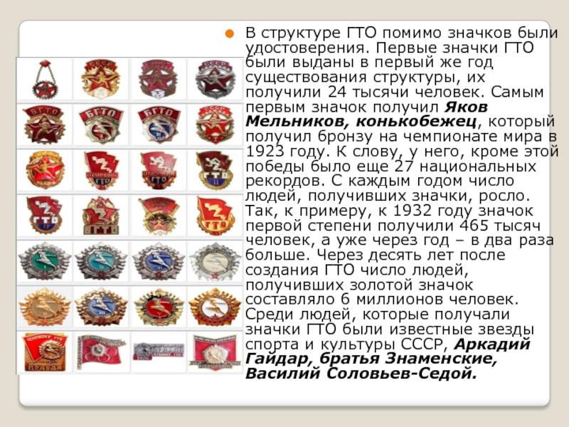 выданы в первый же год существования структуры, их получили 24 тысячи человек. Самым первым значок получил Яков Мельников, конькобежец, который получил бронзу на чемпионате мира в 1923 году. К слову, у него, кроме этой победы было еще 27 национальных рекордов. С каждым годом число людей, получивших значки, росло. Так, к примеру, к 1932 году значок первой степени получили 465 тысяч человек, а уже через год – в два раза больше. Через десять лет после создания ГТО число людей, получивших золотой значок составляло 6 миллионов человек. Среди людей, которые получали значки ГТО были известные звезды спорта и культуры СССР, Аркадий Гайдар, братья Знаменские, Василий Соловьев-Седой.