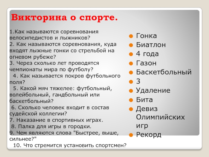 Слайд 14Викторина о спорте.