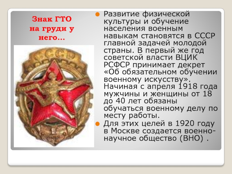 военным навыкам становятся в СССР главной задачей молодой страны. В первый же год советской власти ВЦИК РСФСР принимает декрет «Об обязательном обучении военному искусству». Начиная с апреля 1918 года мужчины и женщины от 18 до 40 лет обязаны обучаться военному делу по месту работы.