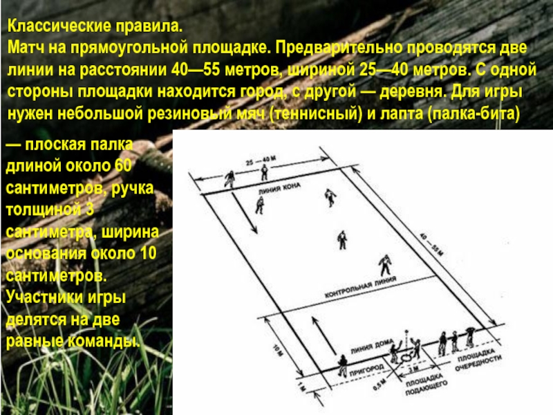 40—55 метров, шириной 25—40 метров. С одной стороны площадки находится город, с другой — деревня. Для игры нужен небольшой резиновый мяч (теннисный) и лапта (палка-бита)
