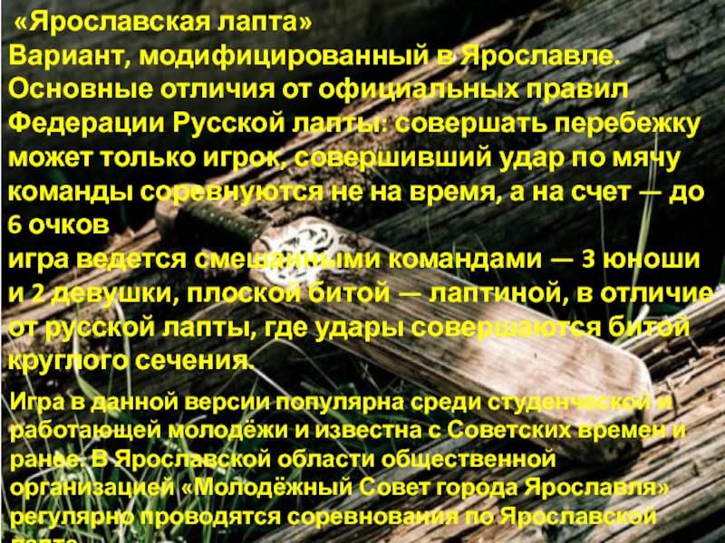 Игра в данной версии популярна среди студенческой и работающей молодёжи и известна с Советских времен и ранее. В Ярославской области общественной организацией «Молодёжный Совет города Ярославля» регулярно проводятся соревнования по Ярославской лапте.
