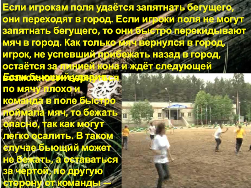 Слайд 11Если игрокам поля удаётся запятнать бегущего, они переходят в город. Если