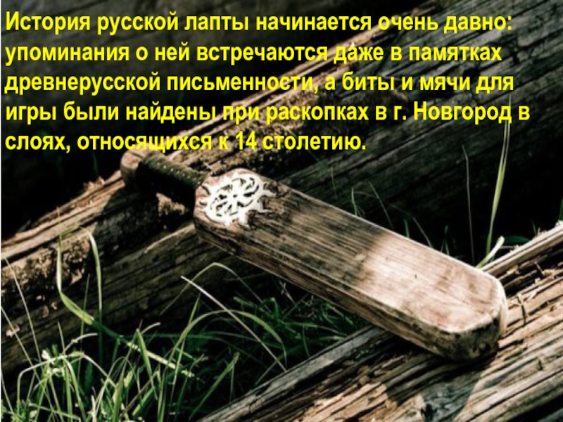 в памятках древнерусской письменности, а биты и мячи для игры были найдены при раскопках в г. Новгород в слоях, относящихся к 14 столетию.