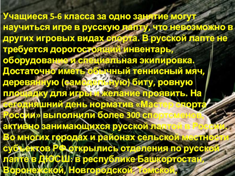 лапту, что невозможно в других игровых видах спорта. В русской лапте не требуется дорогостоящий инвентарь, оборудование и специальная экипировка. Достаточно иметь обычный теннисный мяч, деревянную (самодельную) биту, ровную площадку для игры и желание проявить. На сегодняшний день норматив «Мастер спорта России» выполнили более 300 спортсменов, активно занимающихся русской лаптой в России. Во многих городах и районах сельской местности субъектов РФ открылись отделения по русской лапте в ДЮСШ: в республике Башкортостан, Воронежской, Новгородской, Томской, Челябинской, Тульской, Амурской, Свердловской областях и других регионах.