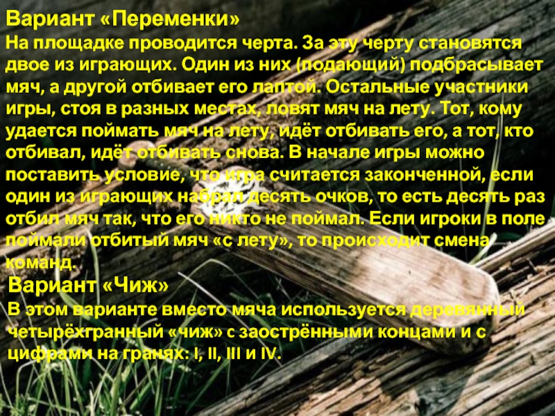 В этом варианте вместо мяча используется деревянный четырёхгранный «чиж» c заострёнными концами и с цифрами на гранях: I, II, III и IV.