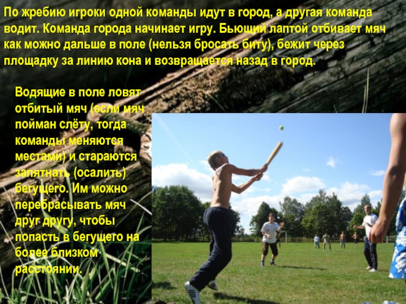 водит. Команда города начинает игру. Бьющий лаптой отбивает мяч как можно дальше в поле (нельзя бросать биту), бежит через площадку за линию кона и возвращается назад в город.