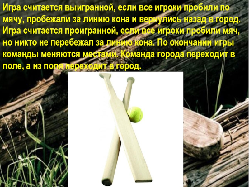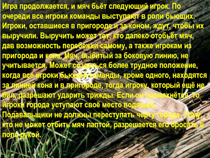 линию кона и вернулись назад в город. Игра считается проигранной, если все игроки пробили мяч, но никто не перебежал за линию кона. По окончании игры команды меняются местами. Команда города переходит в поле, а из поля переходит в город.