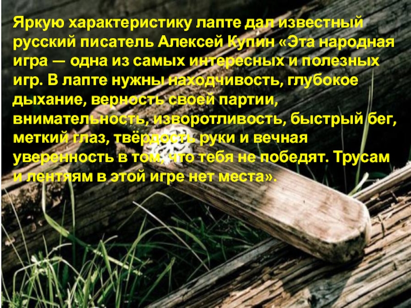 Слайд 17Яркую характеристику лапте дал известный русский писатель Алексей Купин «Эта народная