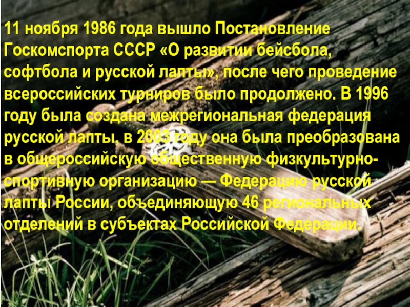 софтбола и русской лапты», после чего проведение всероссийских турниров было продолжено. В 1996 году была создана межрегиональная федерация русской лапты, в 2003 году она была преобразована в общероссийскую общественную физкультурно-спортивную организацию — Федерацию русской лапты России, объединяющую 46 региональных отделений в субъектах Российской Федерации.