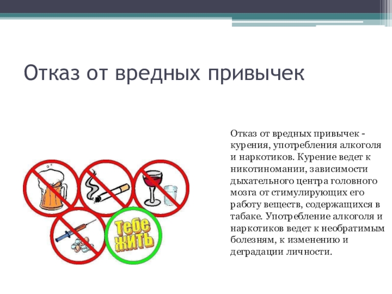 и наркотиков. Курение ведет к никотиномании, зависимости дыхательного центра головного мозга от стимулирующих его работу веществ, содержащихся в табаке. Употребление алкоголя и наркотиков ведет к необратимым болезням, к изменению и деградации личности.
