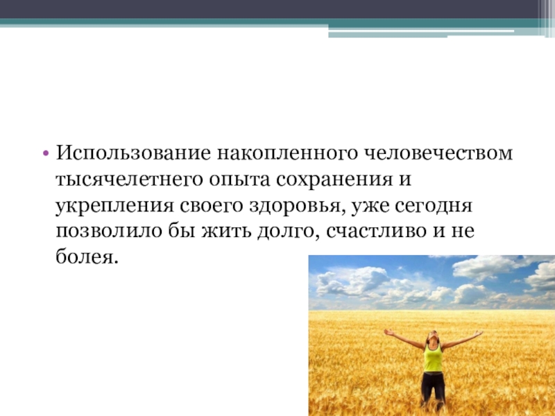 Слайд 4Использование накопленного человечеством тысячелетнего опыта сохранения и укрепления своего здоровья, уже