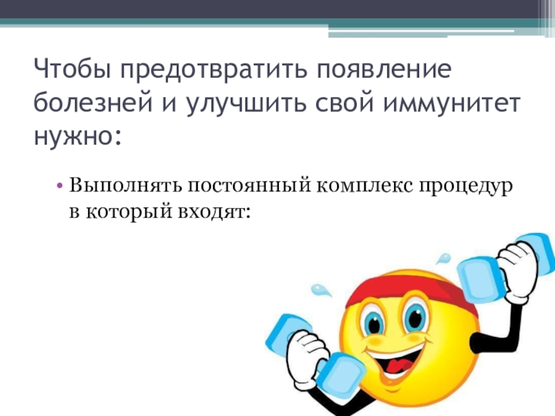 Слайд 11Чтобы предотвратить появление болезней и улучшить свой иммунитет нужно: