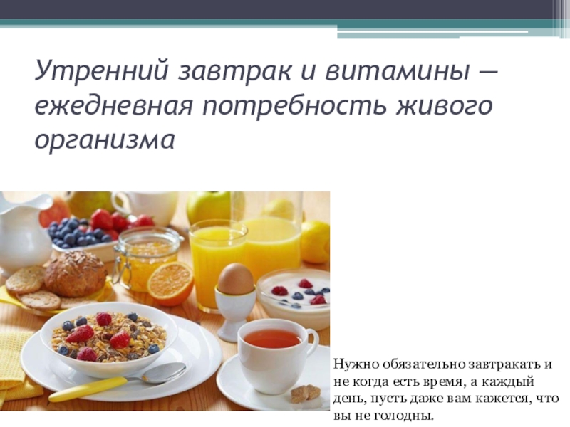 Слайд 12Утренний завтрак и витамины — ежедневная потребность живого организма