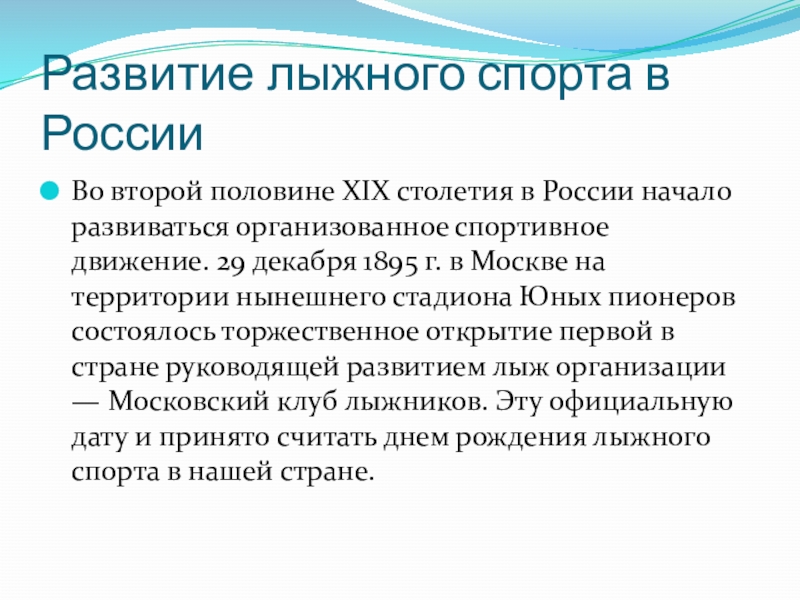 начало развиваться организованное спортивное движение. 29 декабря 1895 г. в Москве на территории нынешнего стадиона Юных пионеров состоялось торжественное открытие первой в стране руководящей развитием лыж организации — Московский клуб лыжников. Эту официальную дату и принято считать днем рождения лыжного спорта в нашей стране.