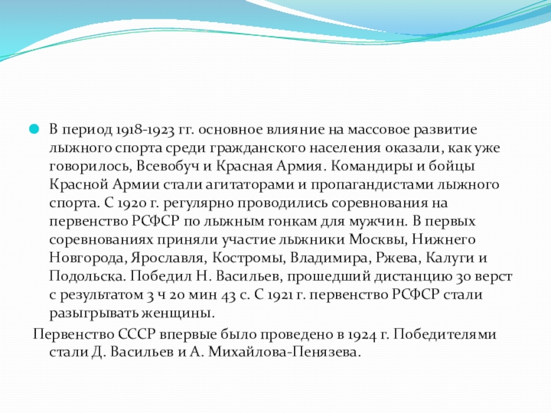 Слайд 5В период 1918-1923 гг. основное влияние на массовое развитие лыжного спорта среди