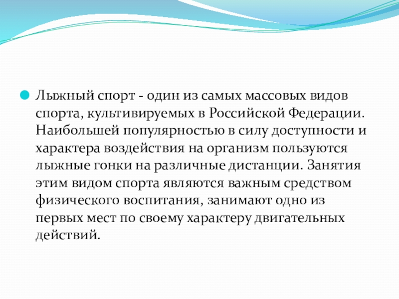 Российской Федерации. Наибольшей популярностью в силу доступности и характера воздействия на организм пользуются лыжные гонки на различные дистанции. Занятия этим видом спорта являются важным средством физического воспитания, занимают одно из первых мест по своему характеру двигательных действий.