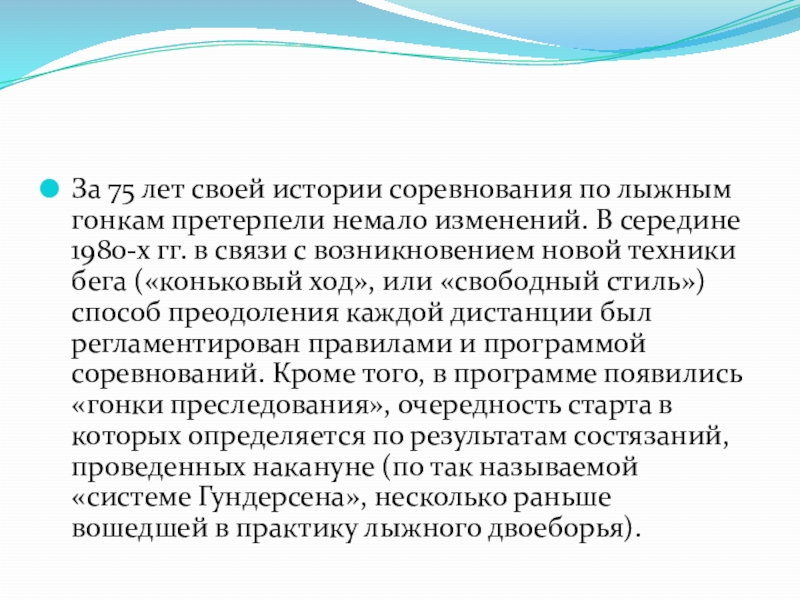Слайд 8За 75 лет своей истории соревнования по лыжным гонкам претерпели немало