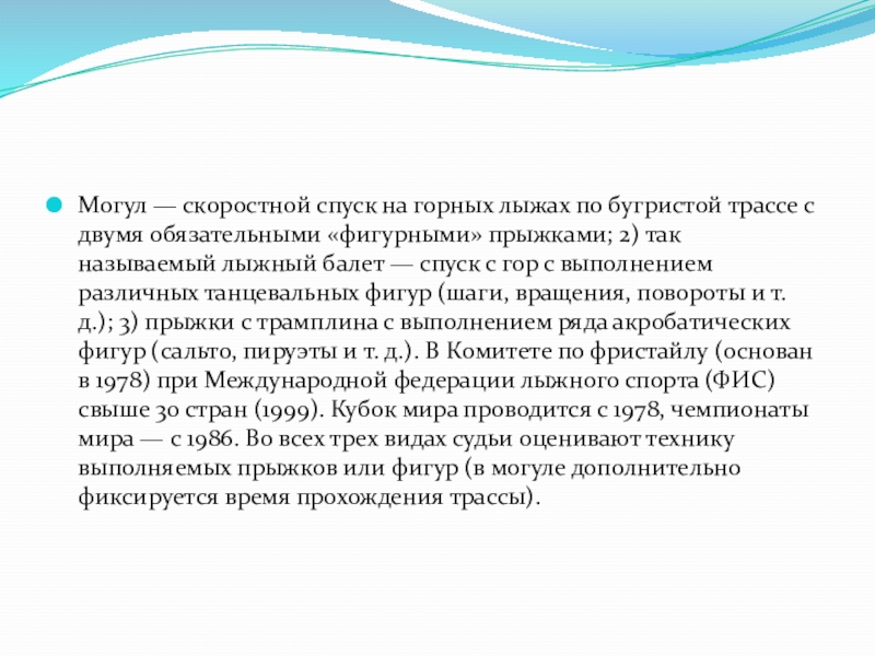 Слайд 11Могул — скоростной спуск на горных лыжах по бугристой трассе с
