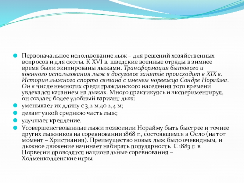 К XVI в. шведские военные отряды в зимнее время были экипированы лыжами. Трансформация бытового и военного использования лыж в досуговое занятие происходит в XIX в. История лыжного спорта связана с именем норвежца Сондре Норайма. Он в числе немногих среди гражданского населения того времени увлекался катанием на лыжах. Много практикуясь и экспериментируя, он создает более удобный вариант лыж: