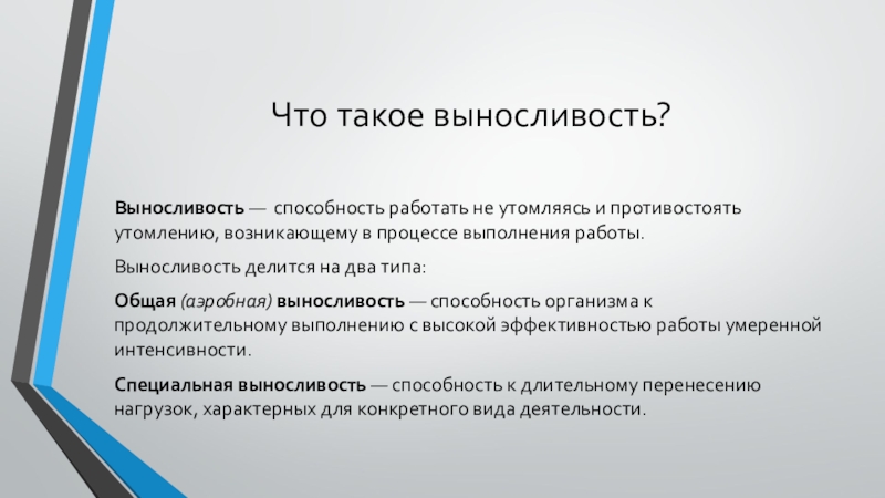 Что такое выносливость?Выносливость — способность работать не утомляясь и противостоять утомлению, возникающему в процессе выполнения работы.Выносливость делится на два типа:Общая (аэробная) выносливость — способность организма к продолжительному выполнению с высокой эффективностью работы умеренной интенсивности.Специальная выносливость —