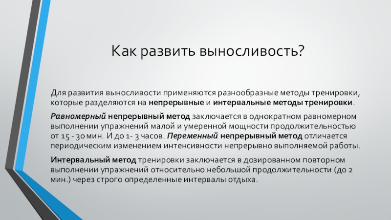 Как развить выносливость?Для развития выносливости применяются разнообразные методы тренировки, которые разделяются на непрерывные и интервальные методы тренировки.