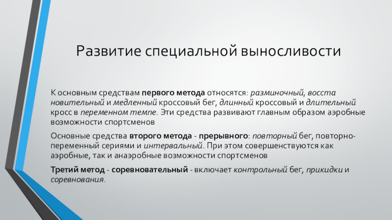 Развитие специальной выносливостиК основным средствам первого метода относятся: разминочный, восста­новительный и медленный кроссовый бег, длинный кроссовый и