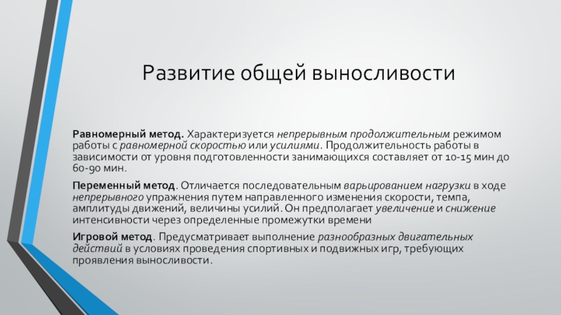 Развитие общей выносливостиРавномерный метод. Характеризуется непрерывным продолжительным режимом работы с равномерной скоростью или усилиями. Продолжительность работы в