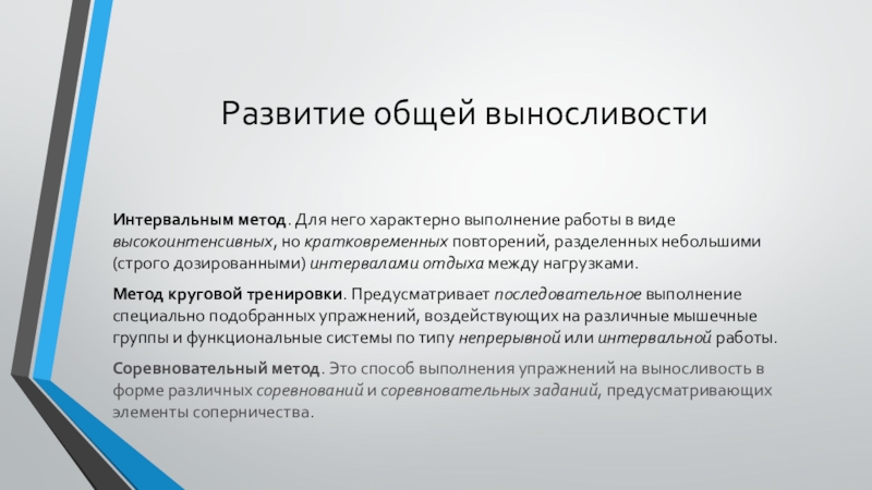 Развитие общей выносливостиИнтервальным метод. Для него характерно выполнение работы в виде высокоинтенсивных, но кратковременных повторений, разделенных небольшими