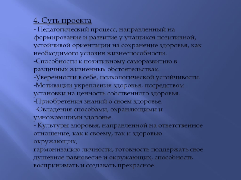 гармонизацию личности, готовность поддержать свое душевное равновесие и окружающих, способность воспринимать и создавать прекрасное.
