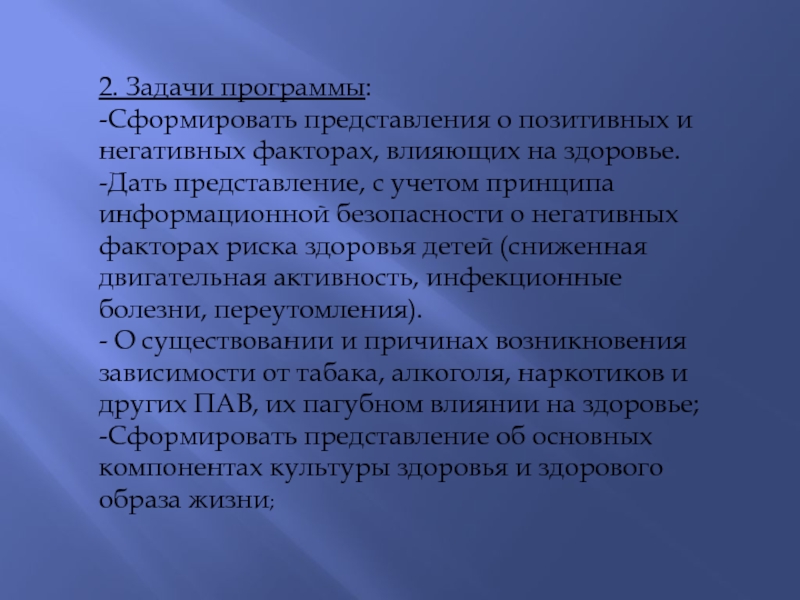 - О существовании и причинах возникновения зависимости от табака, алкоголя, наркотиков и других ПАВ, их пагубном влиянии на здоровье;