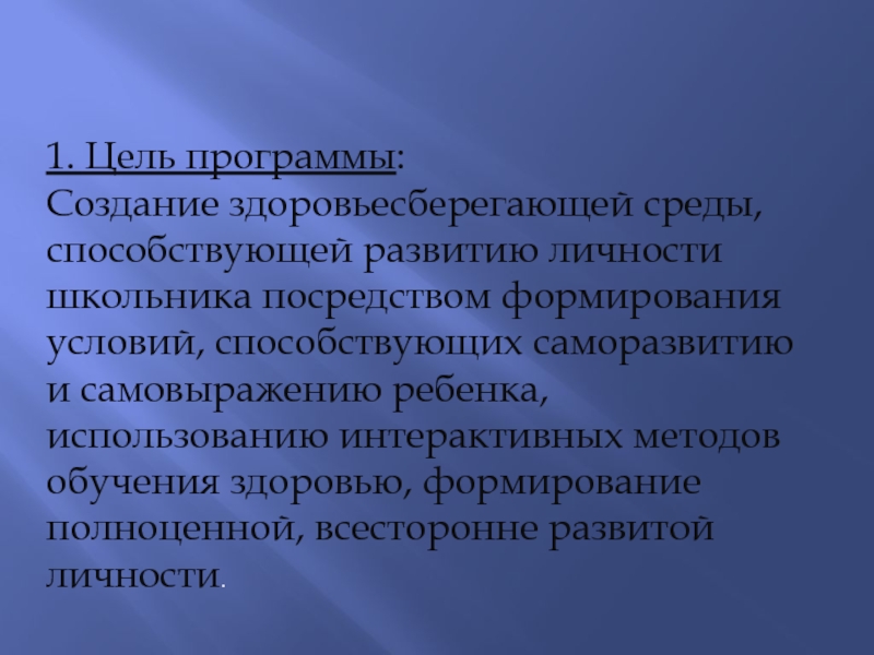 формирования условий, способствующих саморазвитию и самовыражению ребенка, использованию интерактивных методов обучения здоровью, формирование полноценной, всесторонне развитой личности.