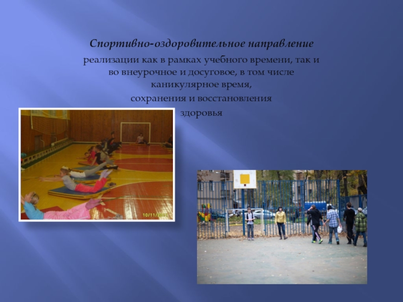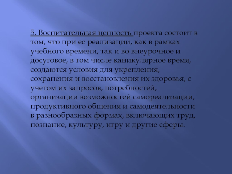 как в рамках учебного времени, так и во внеурочное и досуговое, в том числе каникулярное время, создаются условия для укрепления, сохранения и восстановления их здоровья, с учетом их запросов, потребностей, организации возможностей самореализации, продуктивного общения и самодеятельности в разнообразных формах, включающих труд, познание, культуру, игру и другие сферы.