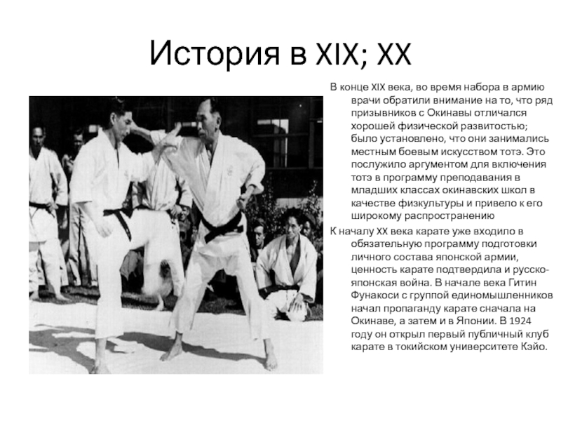К началу XX века карате уже входило в обязательную программу подготовки личного состава японской армии, ценность карате подтвердила и русско-японская война. В начале века Гитин Фунакоси с группой единомышленников начал пропаганду карате сначала на Окинаве, а затем и в Японии. В 1924 году он открыл первый публичный клуб карате в токийском университете Кэйо.