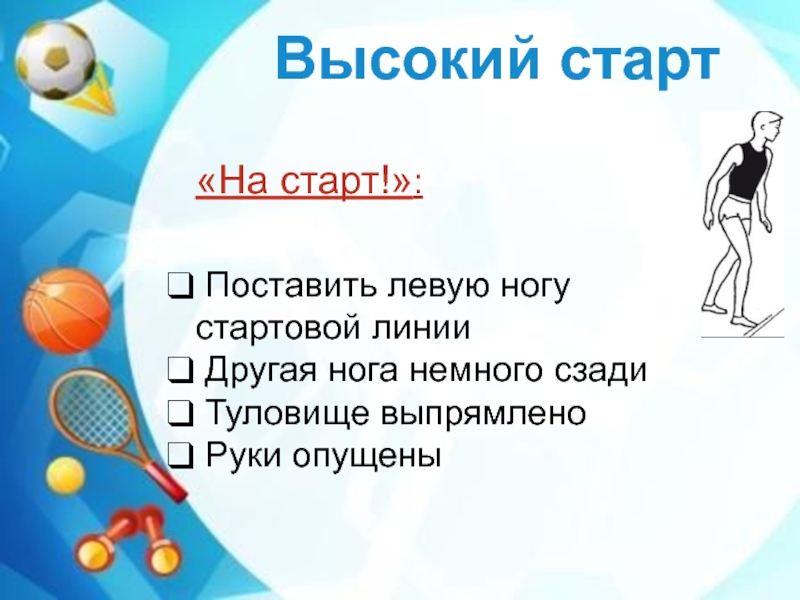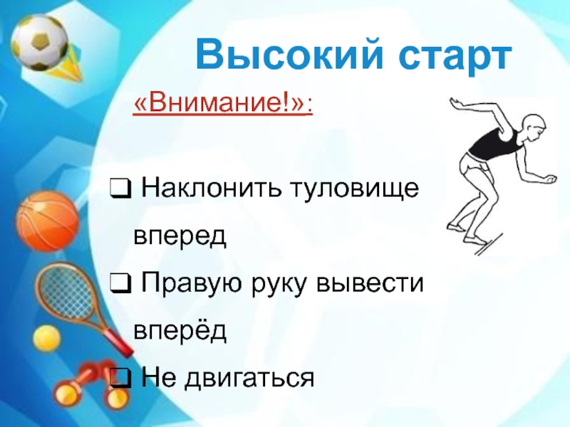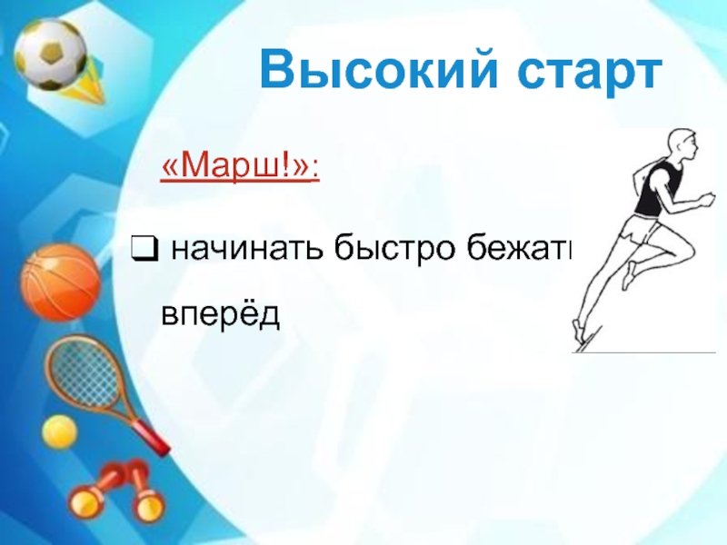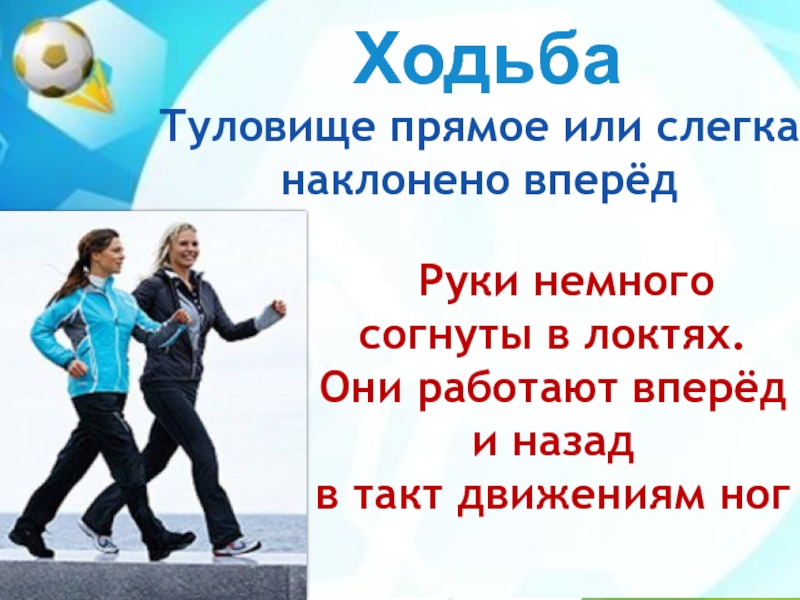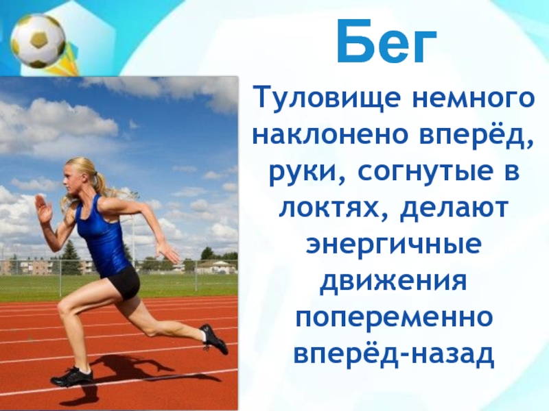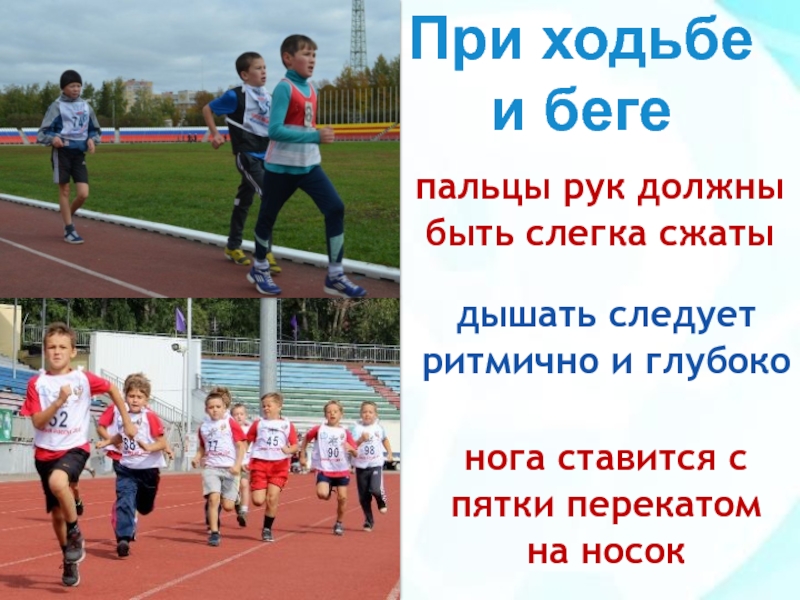 Руки немного согнуты в локтях. Они работают вперёд и назад