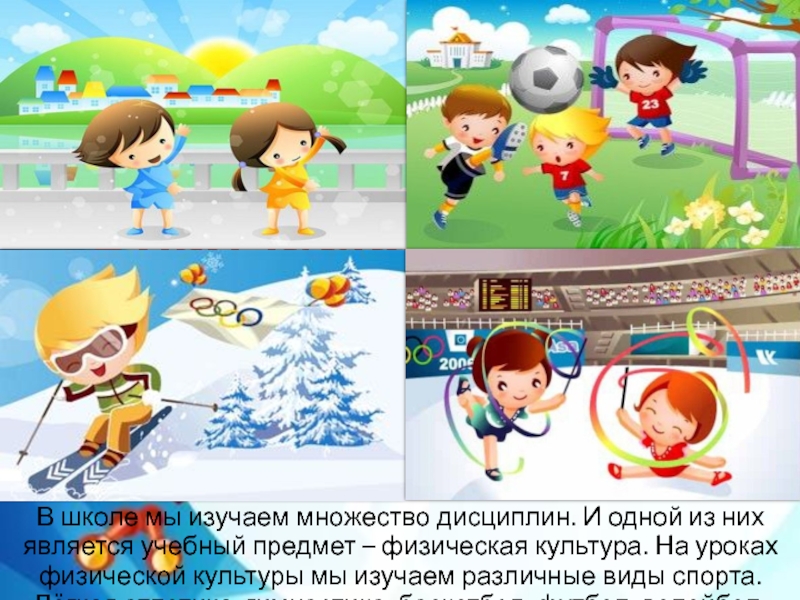 В школе мы изучаем множество дисциплин. И одной из них является учебный предмет – физическая культура. На уроках физической культуры мы изучаем различные виды спорта. Лёгкая атлетика, гимнастика, баскетбол, футбол, волейбол, лыжи.