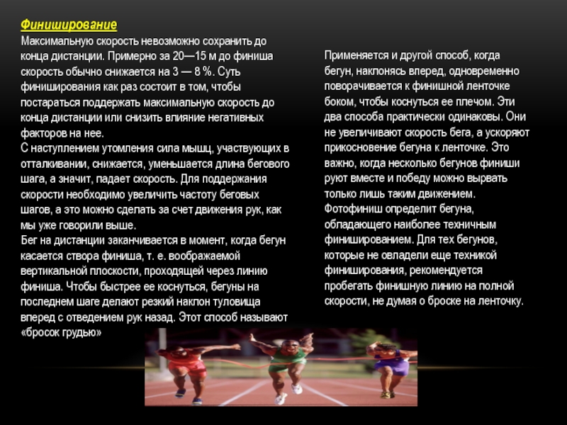 Применяется и другой способ, когда бегун, наклонясь вперед, одновременно поворачивается к финишной ленточке боком, чтобы коснуться ее плечом. Эти два способа практически одинаковы. Они не увеличивают скорость бега, а ускоряют прикосновение бегуна к ленточке. Это важно, когда несколько бегунов финишируют вместе и победу можно вырвать только лишь таким движением. Фотофиниш определит бегуна, обладающего наиболее техничным финишированием. Для тех бегунов, которые не овладели еще техникой финиширования, рекомендуется пробегать финишную линию на полной скорости, не думая о броске на ленточку.