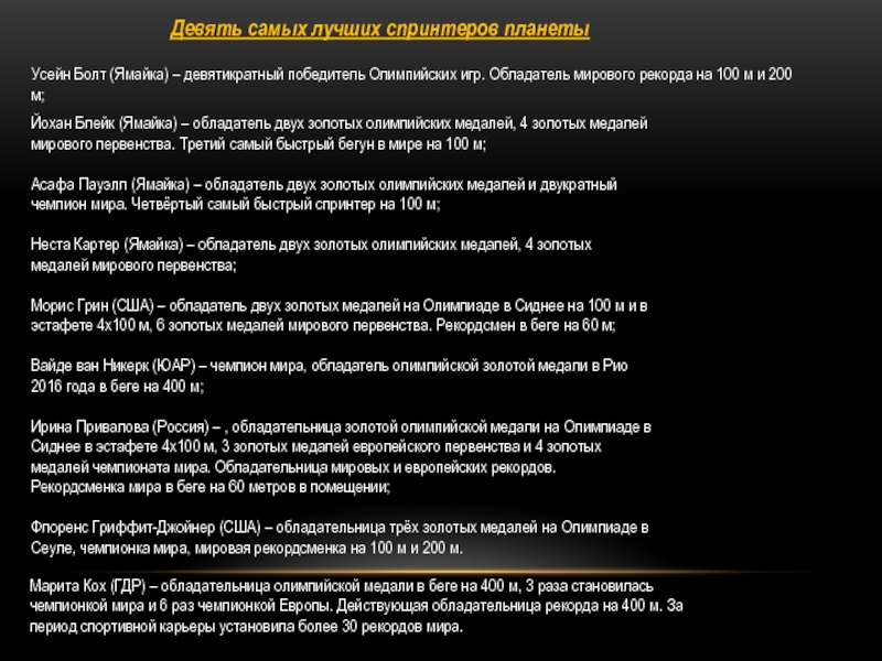 Морис Грин (США) – обладатель двух золотых медалей на Олимпиаде в Сиднее на 100 м и в эстафете 4х100 м, 6 золотых медалей мирового первенства. Рекордсмен в беге на 60 м;