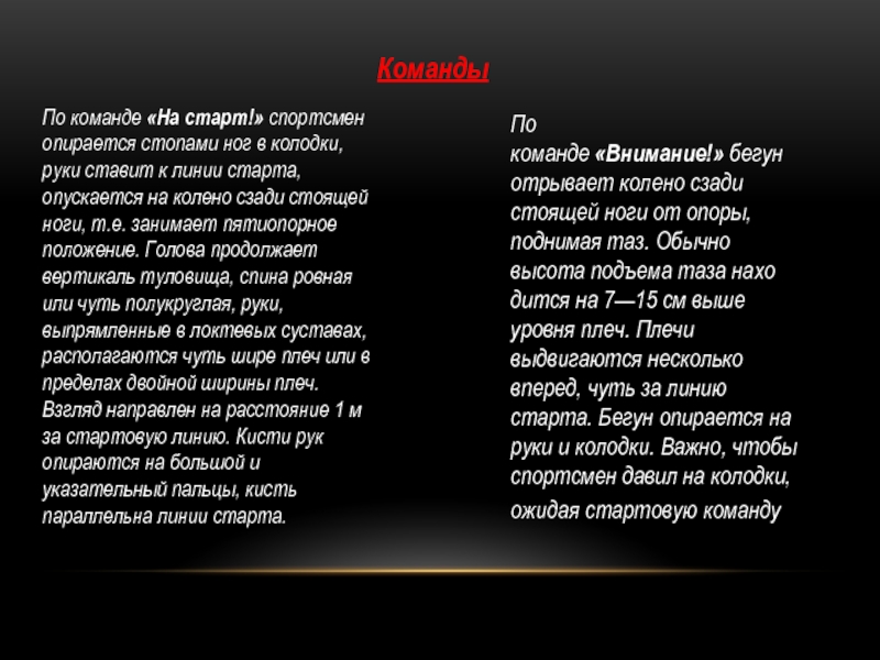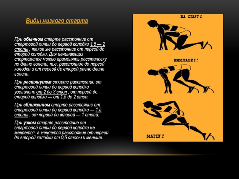 По команде «Внимание!» бегун отрывает колено сзади стоящей ноги от опоры, поднимая таз. Обычно высота подъема таза находится на 7—15 см выше уровня плеч. Плечи выдвигаются несколько вперед, чуть за линию старта. Бегун опирается на руки и колодки. Важно, чтобы спортсмен давил на колодки, ожидая стартовую команду