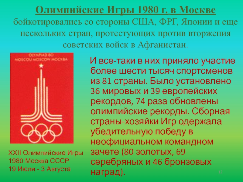 И все-таки в них приняло участие более шести тысяч спортсменов из 81 страны. Было установлено 36 мировых и 39 европейских рекордов, 74 раза обновлены олимпийские рекорды. Сборная страны-хозяйки Игр одержала убедительную победу в неофициальном командном зачете (80 золотых, 69 серебряных и 46 бронзовых наград).