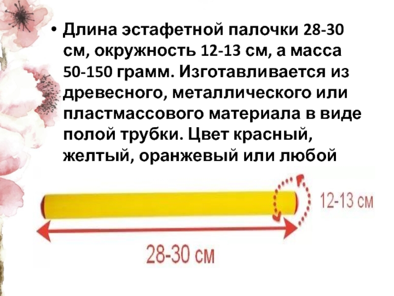 Слайд 14Длина эстафетной палочки 28-30 см, окружность 12-13 см, а масса 50-150