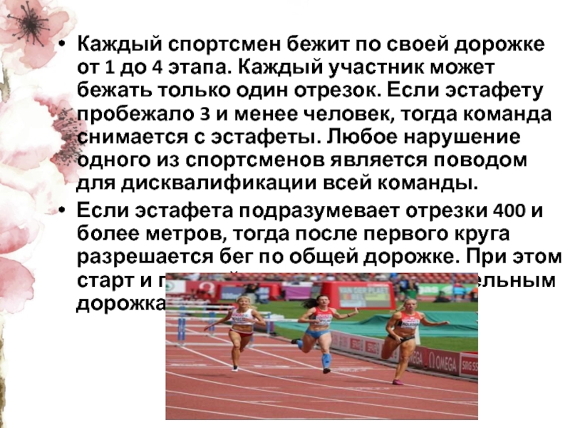 Слайд 17Каждый спортсмен бежит по своей дорожке от 1 до 4 этапа.