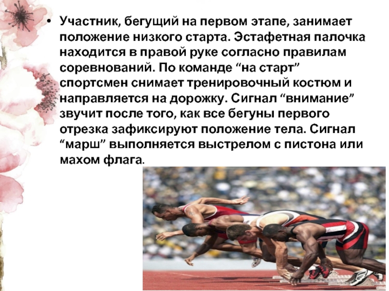 Слайд 5Участник, бегущий на первом этапе, занимает положение низкого старта. Эстафетная палочка