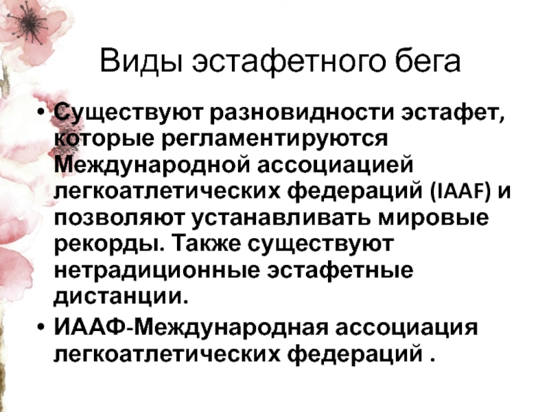 Существуют разновидности эстафет, которые регламентируются Международной ассоциацией легкоатлетических федераций