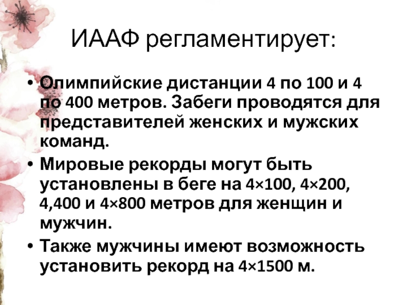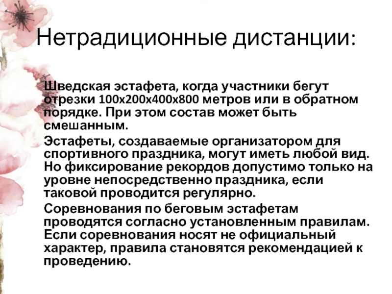 (IAAF) и позволяют устанавливать мировые рекорды. Также существуют нетрадиционные эстафетные дистанции.