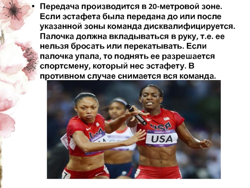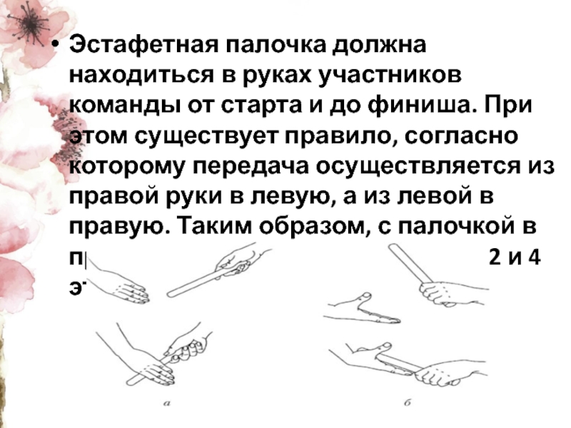 до финиша. При этом существует правило, согласно которому передача осуществляется из правой руки в левую, а из левой в правую. Таким образом, с палочкой в правой руке бегут 1 и 3, а в левой 2 и 4 этапы.
