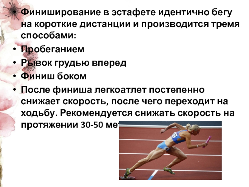 Слайд 9Финиширование в эстафете идентично бегу на короткие дистанции и производится тремя