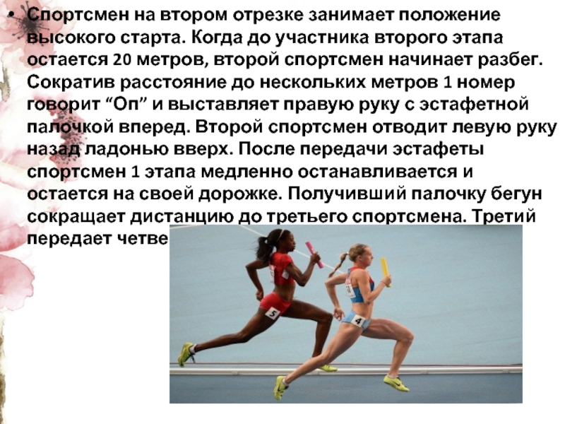 Слайд 7Спортсмен на втором отрезке занимает положение высокого старта. Когда до участника
